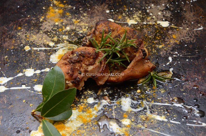 As a lemon tart which has to be dropped I simply decided to use the rabbit. Suddenly my kitchen was full – 1 rabbit, Henri, Jackson, Massimo and myself. You have to know – my kitchen is really small. But there was enough place to make some splashes. Splashes of 4 colored powders: Colman’s mustard, turmeric, bay leaves and dry wild mushroom. Plus some great lemon infused sea salt from Baix Emporda (Catalunya). And when the rabbit disappeared into the depth of a pot we had time to drink some wine – Henri wanted to use it in the recipe, but I use my wine to cook only sometimes, not this time, not today!